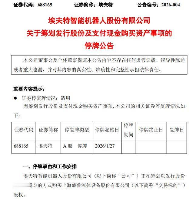 2026年1月26日晚间,埃夫特发布关于筹划发行股份及支付现金购买资产事项的停牌公告,预计从1月27日开始停牌,不超过10个交易日。